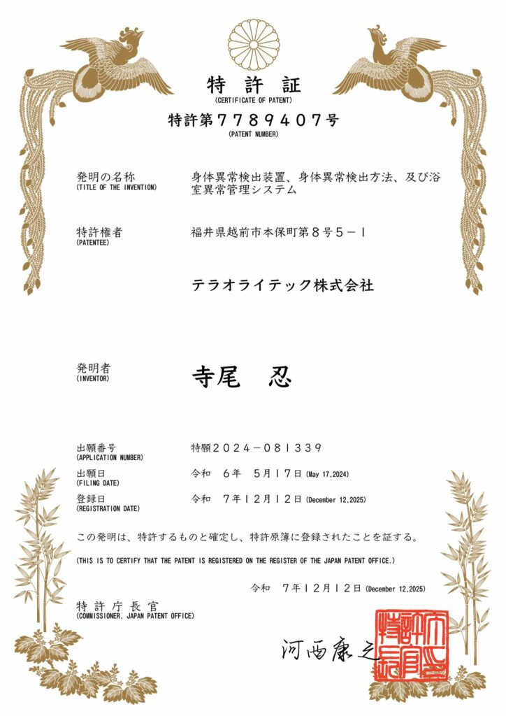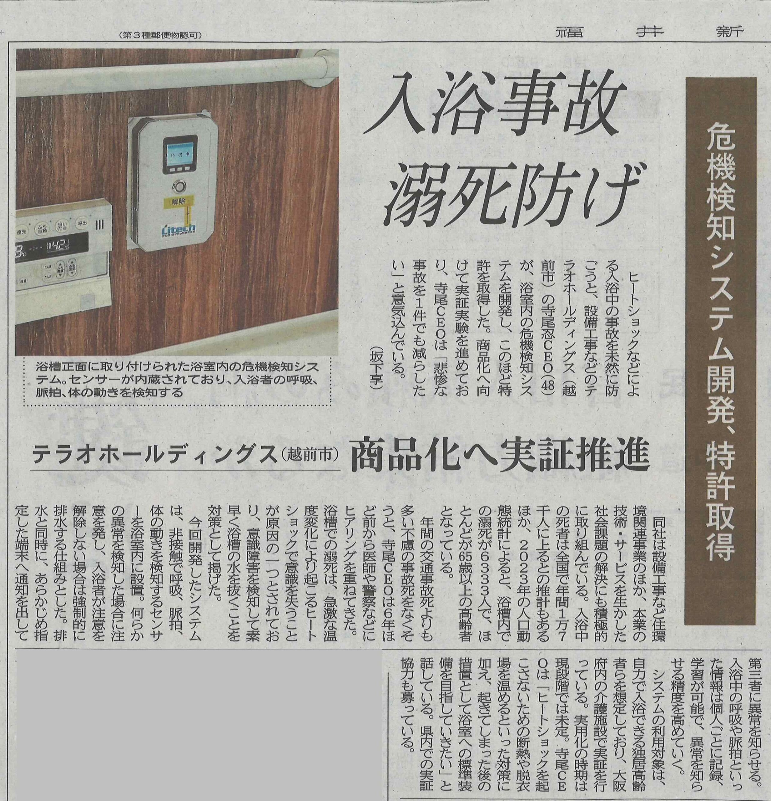 「高齢者の浴槽内での溺死を防ぐシステムを開発」2026.01.28/NEWS 2026年1月28日「福井新聞」掲載 弊社相談役 寺尾忍がヒートショックなどによる入浴中の事故を未然に防ぐため、浴室内の危機検知システムを開発し、このほど特許を取得しました。 危機検知システムを詳しくみる >