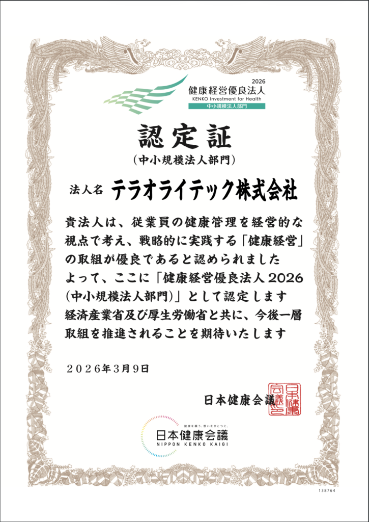 テラオライテックでは、従業員一人ひとりが心身ともに健康でいきいきと働ける環境づくりを重要な経営課題と捉え、さまざまな取り組みを推進してまいりました。