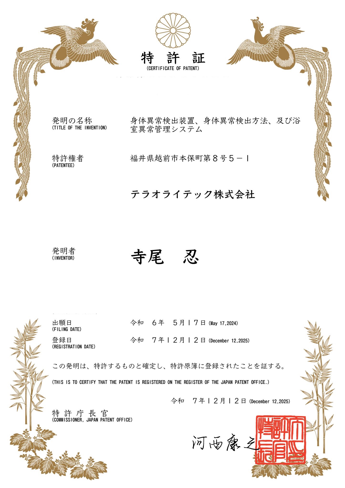 「高齢者の浴槽内での溺死を防ぐシステムを開発」2026.01.28/NEWS 2026年1月28日「福井新聞」掲載 弊社相談役 寺尾忍がヒートショックなどによる入浴中の事故を未然に防ぐため、浴室内の危機検知システムを開発し、このほど特許を取得しました。 危機検知システムを詳しくみる >